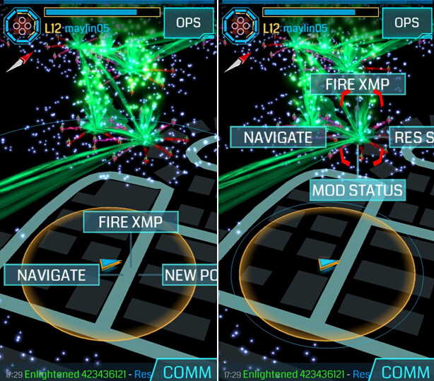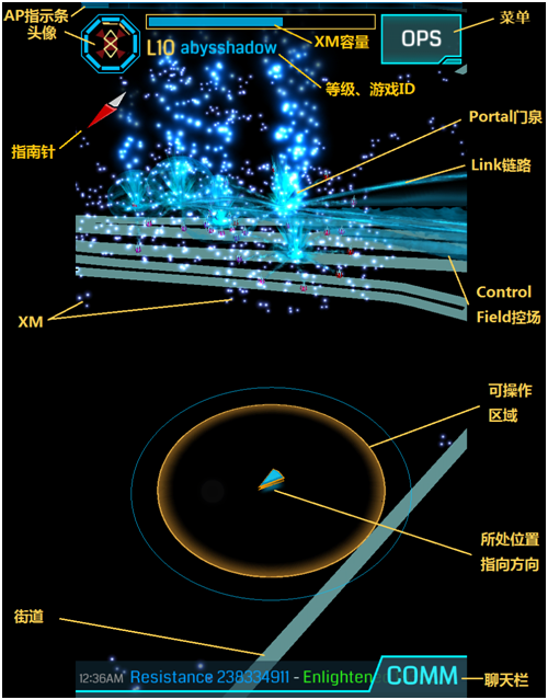 当Portal在行动圈外时,上为FIRE XMP(攻击),下为MOD STATUS(加强mod),左为NAVIGATE(导航),右为RES STATUS(看脚)。