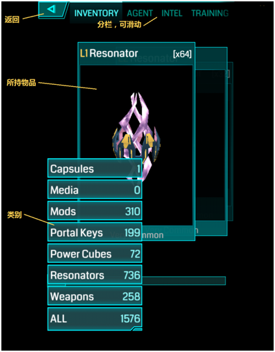 Capsules胶囊、Media情报、Mods模块、Portal Keys钥匙、Power Cubes能量块、Resonators共振器、Weapons武器。